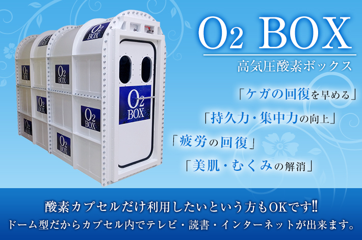 酸素療法とは1.3気圧まで上昇したボックスの中に20分~60分入ることにより、血中酸素濃度が濃くなり、その結果、体内の各細胞の酸素量が増加し、活性化と各機能の増進を図ります。この機能増進の結果が、除痛効果であったり、回復力が旺盛になったり、筋疲労を早期に取り除いたりします。膝痛、腰痛、肩痛、手指のしびれにも効果があります。酸素BOXの効果